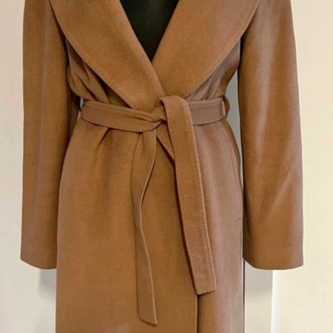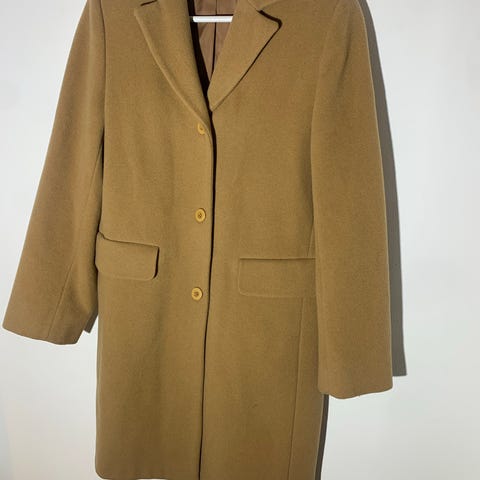 Hugo Boss stilig beige yllekappa med hög krage.