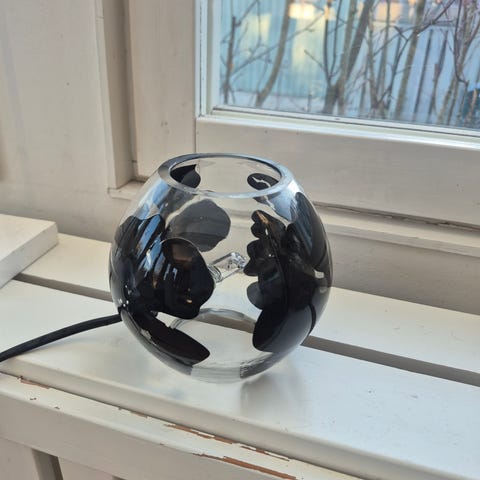 Detta är ett gediget hantverk som verkligen kommer till sin rätt när det belyses underifrån. Den medföljande ljussockeln (svart med strömbrytare) skapar ett magiskt sken och gör skulpturen till en perfekt stämningslampa eller ett blickfång i bokhyllan.