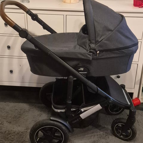 Britax smile 2 barnvagn i grå färg med sitt- och liggdel. Barnvagnen har justerbart handtag och säkerhetsbåge. Mycket fint skick och slitstarkt material.