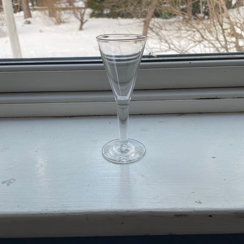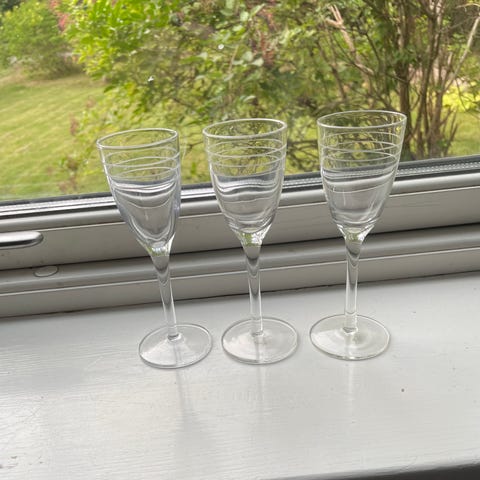 Set med tre snapsglas i klart glas. Glasen har en smal kupa och en tunn fot.