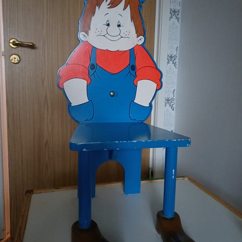 Bord 118x74cm på längsta och bredaste stället. Stol med nät i ryggstödet.