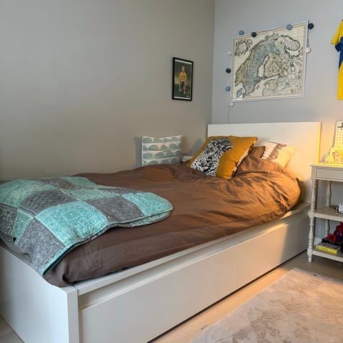 IKEA bädd med tre lådor för förvaring under sängen. Sängen är vit och beige/träfärgad och har en grå madrass.