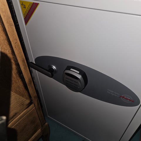 Diplomat 170 brandsäkert skåp i beige färg med kombinationslås. Skåpet är utformat för säker förvaring av värdeföremål och dokument.