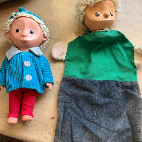 Handgjorda handdockor i olika karaktärer, inklusive en djävul, en äldre man, en djävuloch två andra figurer. Dockorna är tillverkade av textil och plastmaterial och är avsedda för handdockteater eller lek.50år gamla samlarobjekt