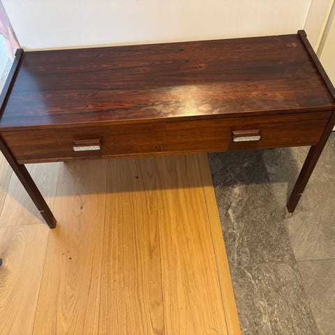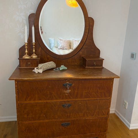 Hallmöbel, byrå med korgar, och spegel. Korgarna är tygklädda på insidan.