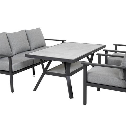 Soffan är av vattentåligt tyg vilket innebär att den klarar av vatten och vind och kan stå utomhus utan problem.