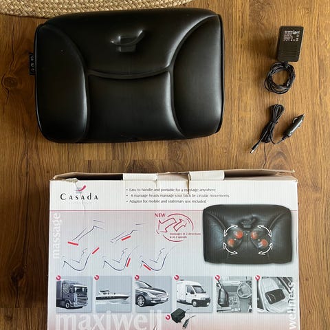 Kudden har manöverenhet/fjärrkontroll för full kontroll över massagen med justering av rotationsriktning, värme, av/på samt nätdel för vägguttag.
