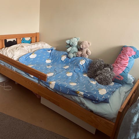 Säljer en fin barnsäng i fint använt skick, finns med madrass samt förvaring under, hjulen till lådan är i blandat skick men fungerar.