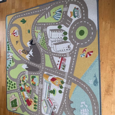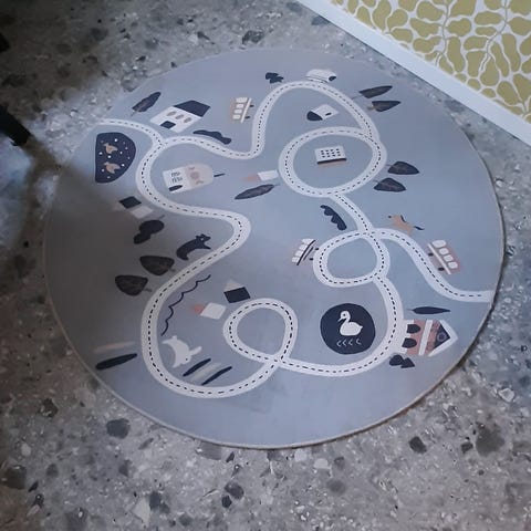Troll barnmatta med rymdtema, rund form och tryck med solsystemets planeter och rymdobjekt. Mattan har mjuka färger och är lämplig för barnrum.