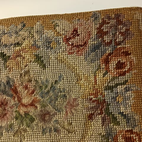 Vacker fotpall i antik stil med broderad sits