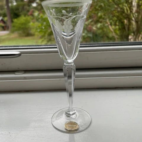 Två kristallglas med graverade blommotiv. Glasen är klara och har en dekorativ slipning på foten och kupa. Passar för servering av drycker i mindre mängder.