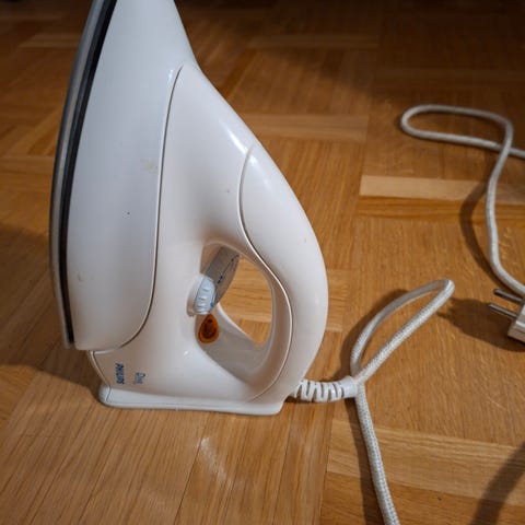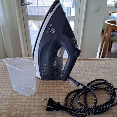 Philips strykjärn i vit färg. Utrustad med sladd och inställningsknappar för temperaturkontroll. Passar för hushållsbruk vid strykning av kläder.