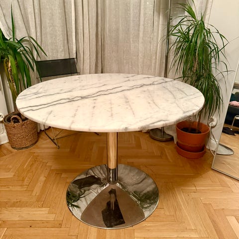 Fint runt matbord med marmorskiva. 120 cm diameter och 80 högt. Fint.