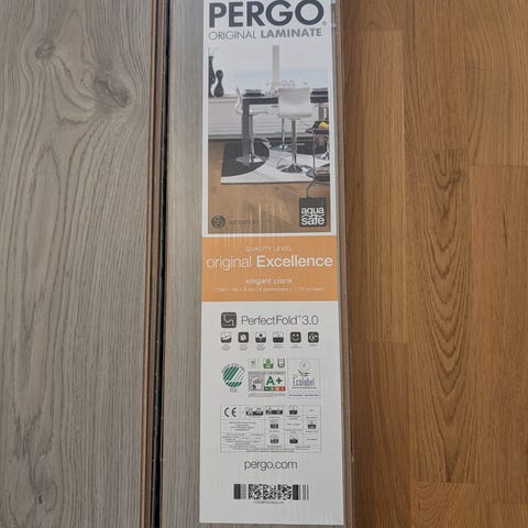 Det blev över två paket.. Så vill du köpa ett fint golv som hör till den övre prisklassen får du passa på nu! :) Pergo Black Diamond Oak laminatgolv ca: 3 m2 Du får en rulle foam också.