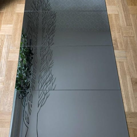 Rusta spegel med oregelbunden form. Spegeln har en dekorativ design utan ram och kan användas som väggdekoration i olika rum.