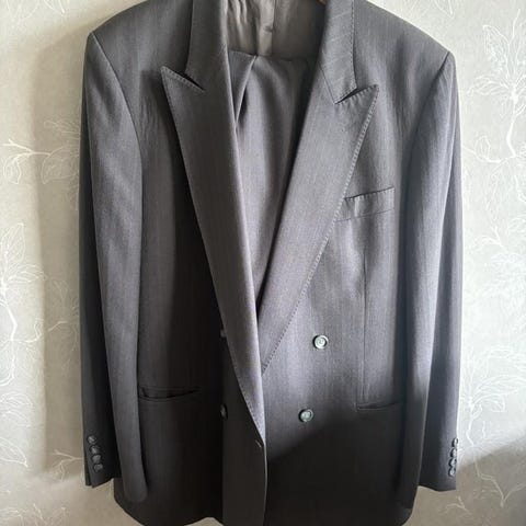 Klassisk dubbelknäppt kostym från Oscar Jacobson, mycket sparsamt använd (ca 6–8 gånger). Svensktillverkad, välskräddad och i mycket fint skick utan slitage.