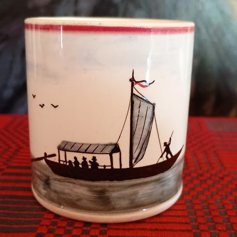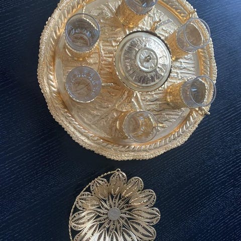 Set bestående av kaffekopp med fat och två mindre assietter + en större i porslin. Dekorerade med guldfärgade detaljer och vackra mönster.