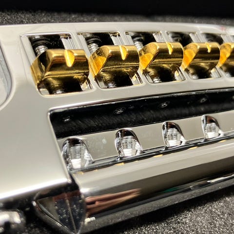 Bridgen är utrustad med roller saddles i massiv mässing, base plate i rostfritt stål samt förstärkta kanter som gör att saddlarna inte kan röra sig. Ett 40 mm tjockt brass block ger ökad sustain, stabilitet och fylligare ton.