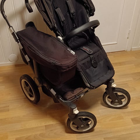 Bugaboo barnvagn dubbelvagn med grå sufflett. Barnvagnen är utformad för att kunna användas för två barn samtidigt. Den har en robust konstruktion och är lämplig för olika terränger. Punkteringsfria däck. Liggdel ingår. Även sommarsufletter och åkpåse.