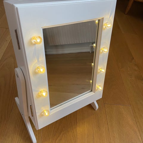 IKEA sminkspegel med belysning i vit färg. Spegeln är utrustad med flera lampor runt kanten för jämnt ljus och har stöd för både bord och väggmontering. Strömanslutning via sladd för belysning.