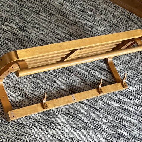 Habo hatthylla 50-tal/60-tal i trä och mässingfärgad metall med två krokar i plast. Superfin men som tyvärr är för liten i vår nya lägenhet.