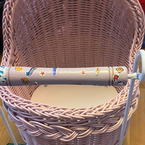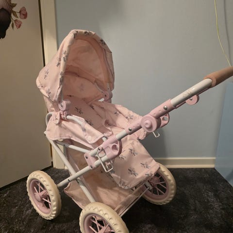 Vagn i rotting för dockor med vit färg. Vagnen har hjul och handtag för enkel förflyttning. Passar för lek med dockor och som dekorativt föremål.
