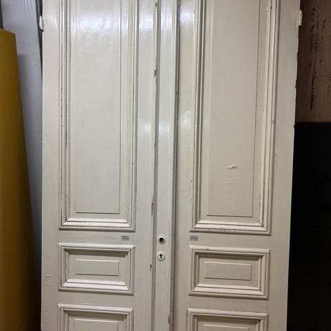Trädörrar i trä med flera glasrutor. Dörrarna är av traditionell design med träpaneler och glasindelning, Munblåst glas i