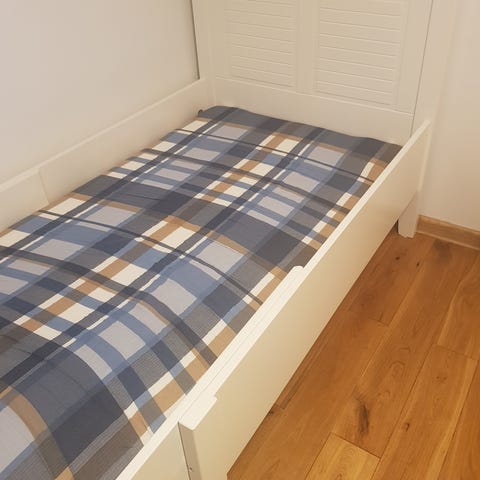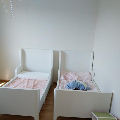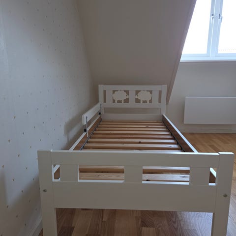 Utdragbar rejäl barnsäng i trä. Bra skick. Madrass IKEA ”vyssja” 80x130-165-200cm. (Kan byggas ut i sektioner) madrassen har tvättbart överdrag.