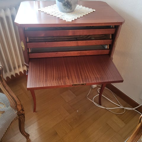 Väggklocka, kristallskål, stol, sybord,shatull/skåp