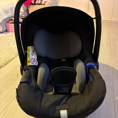 Britax Römer Babyskydd med storlek 13. Produkten är avsedd för barn och har en svart färg. Babyskyddet är utrustat med säkerhetsbälten och ett bärhandtag för transport.