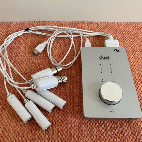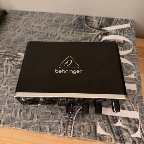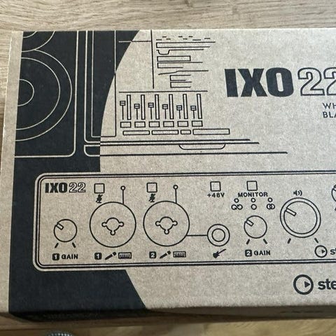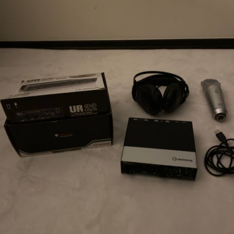 Steinberg UR12 ljudinterface med två ingångar, MIDI I/O, och USB-anslutning. Enheten har en robust metallkonstruktion i silverfärg och är avsedd för inspelning och ljudproduktion.
