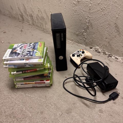 Xbox Original Xbox-konsol inklusive fyra handkontroller med kablar och tre spel. Produkten är svart och avsedd för spel på Xbox-plattformen.