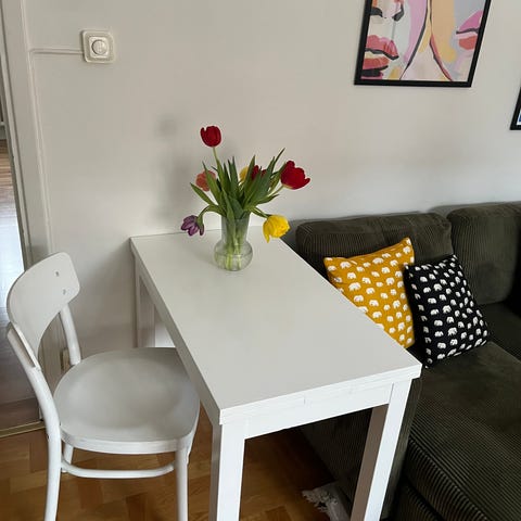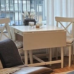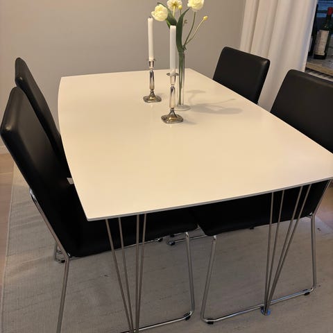 Säljer ett stilrent vitt matbord med två tillhörande stolar. Bordet är kvadratiskt och passar perfekt i mindre kök, studentlägenhet eller som matplats i ett kombinerat rum. Stabil konstruktion och tidlös design.