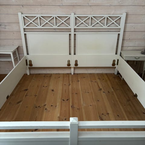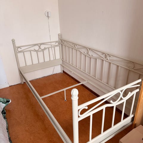 Sängen är i tydligt använt skick men fungerar. Två plankor undertill sitter löst men går att sätta på plats.