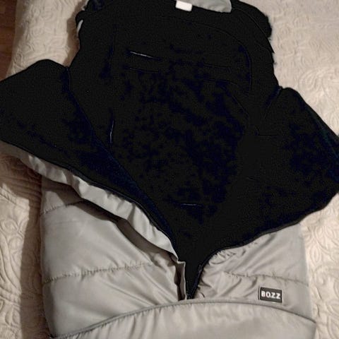 Tjock och varm åkpåse som man kan ha länge då påsen går att göra till ett sittunderlag i sulky .