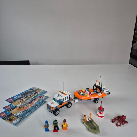 LEGO City båt med tillbehör inklusive minifigurer och olika delar för lek och byggande.
