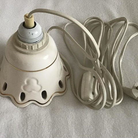 Blå lampa, vi har använt den som taklampa men lite klent ljus så passar nog bäst som fönsterlampa. Fint skick, inge tydliga märken på den.