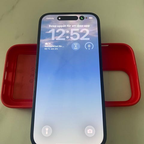 Säljer en iPhone 13 pro, gold, cirka tre år gammal i bra skick utan repor och skador, batterihälsa 85%, skickar även med ett plånboksfodral
