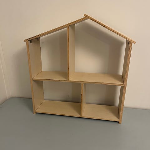 Alice & Fox Dockskåp i trä med tre våningar och trappa, i färgerna grå och vit. Ommålat efter inköp. Passar som leksak för barn och kan användas för inredning och lek. Bord och stolar, kanindocka, dekorativa bakelser och potta från märket Maileg.