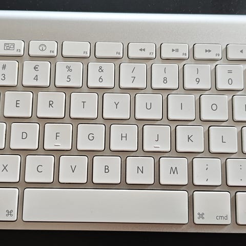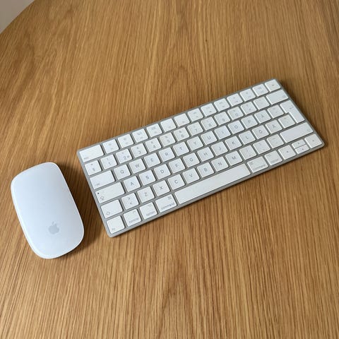 Apple tangentbord och mus i vitt. Komplett set för datoranvändning med trådlös anslutning via Bluetooth. Drivs med hjälp av AA batterier. Modeller A1314 och A1296.