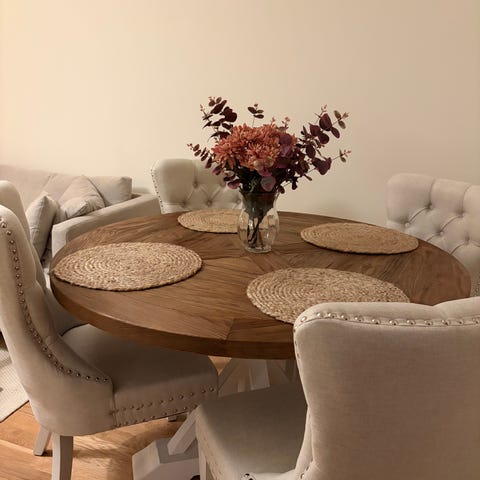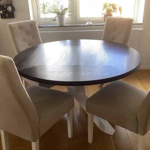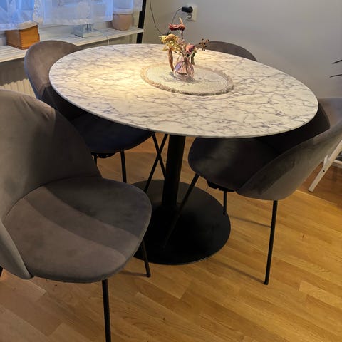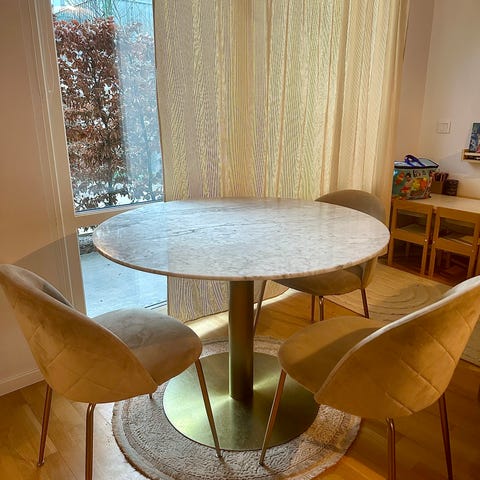 Säljer en fantastiskt fin och komplett matgrupp i absolut nyskick. Bordet är ett runt designbord från &Tradition med en massiv vit marmorskiva och elegant fot i mässing.