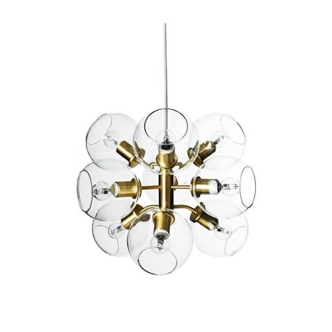 Atom taklampa är en sofistikerad och modern pendellampa som kommer att förgylla ditt hem. Tillverkad i svartlackerad metall och utrustad med fem fasta armar som bär rökfärgade glaskupor, ger denna lampa en elegant touch till varje rum.