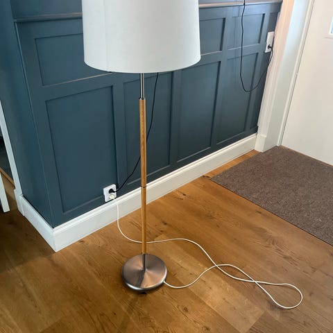 Säljer en stilren golvlampa i metall med ljus textilskärm.
