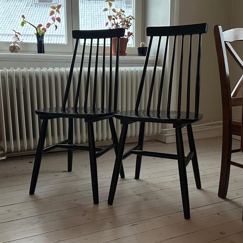 4 stycken pinnstolar ”Norraryd” från IKEA. Ursprungligen vita men har målats svarta. Har några skavanker men inget som syns tydligt, annars hela och fullt funktionella.