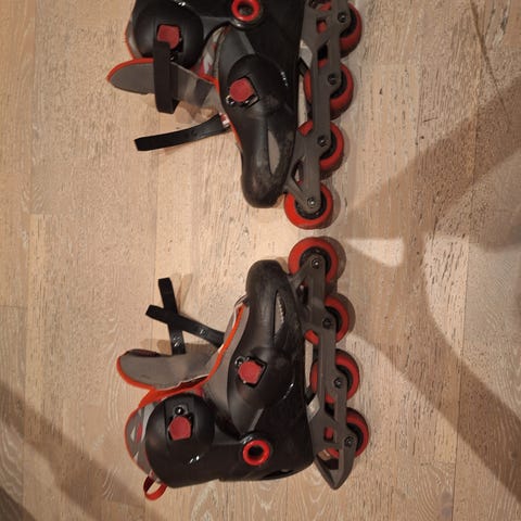 Avanta rullskridskor i storlek 35 med svart och orange färgsättning. Används för rullskridskoåkning och inlines. Skorna har justerbara spännen för passform och fyra hjul per skridsko.