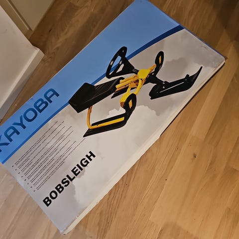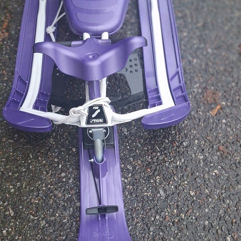 Bob med ratt i lila färg. Produkten är avsedd för vinterlek och transport i snö. Den har en ratt för styrning och är designad för att användas av barn.