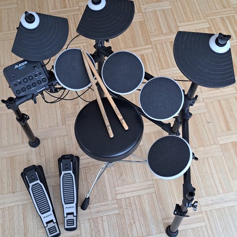Alesis Nitro digitalt trumset med flera trummor och cymbaler, inklusive cymbalmodul och baspedal med olika kontrollknappar och display. Setet är utrustat med trumstockar och en trumstol.