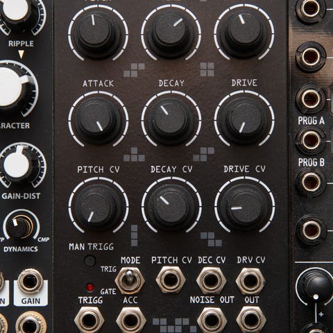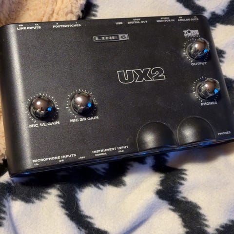 Sonic Potions LXR 1 Drum Machine med flera reglage och knappar för ljudinställningar. Enheten har en digital display och flera anslutningar på baksidan för ljud och kontroll.