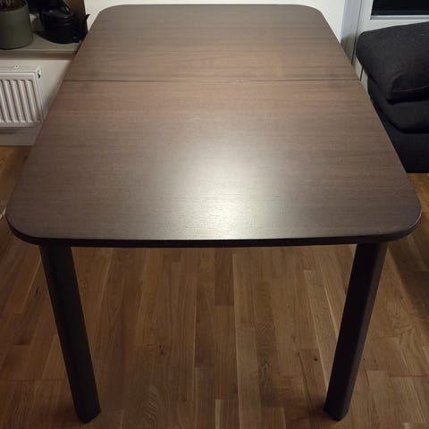 Matbord som går att förlänga med iläggsskivor. Tre olika storlekar 150/205/260x95 cm. Finns två skivor som går att sätta dit eller ta bort väldigt enkelt och förvaras i bordet. En av dessa har en liten skada av fukt, syns bara om man kollar nära och i ett visst ljus. Överlag väldigt fint skick!