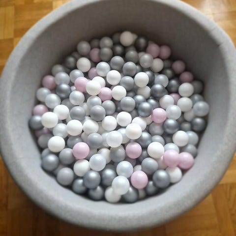 Jollyroom barnpool med bollar i olika grå nyanser. Poolen är rund och tillverkad i skumplastmaterial. Passar för barn och används som lekplats inomhus.